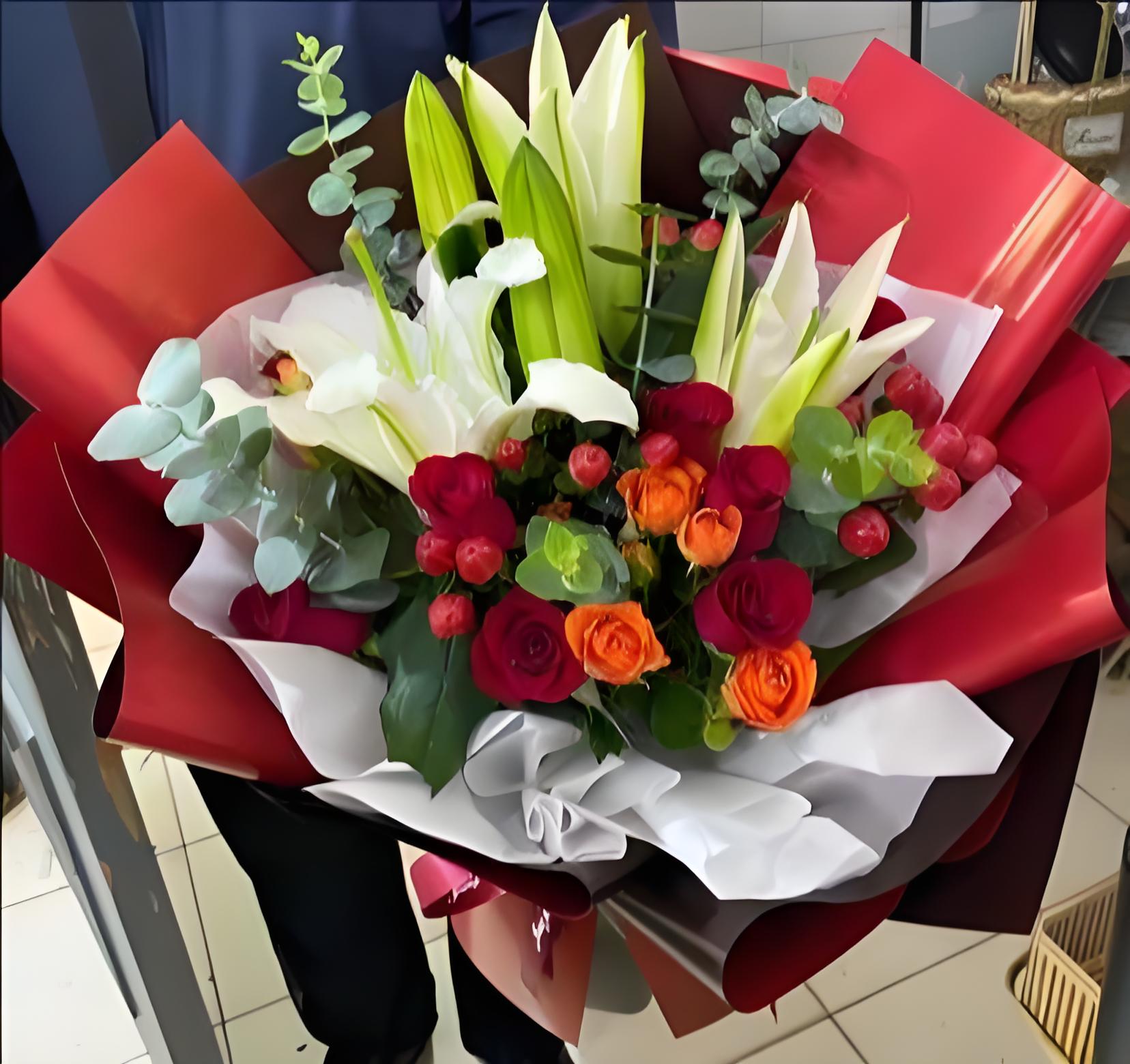 常德临澧县花店包11枝红玫瑰、2枝多头白百合、6枝橙色多头玫瑰、红豆、尤加利叶